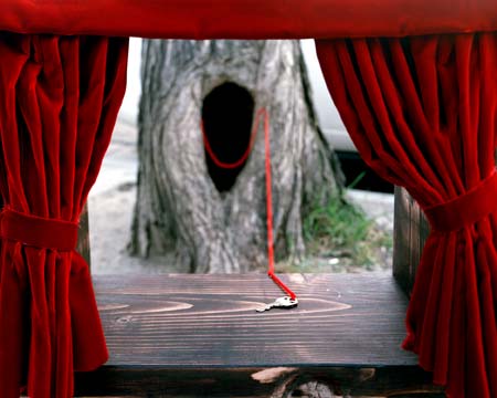 The Red Curtain photographs are part of a visual study examining the potential narrative relationship between object and space. I became interested in making these photographic tableaus after I saw an illustration by Russell H. Tandy in "Message in the Hollow Oak" a Nancy Drew book. The photographs were made in March of 2003 using a 4x5 view camera. |
